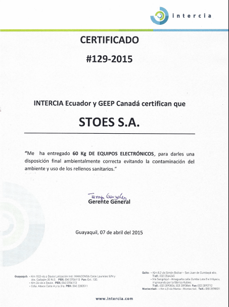En STOES, nos preocupamos por el medio ambiente y los equipos que ya no utilizamos los llevamos a la empresa INTERCIA para ser reciclados. Allí, son desmantelados y todas sus partes se convierten en materia prima. De este modo, desechamos productos que ya no utilizamos y así contribuimos a un mejor mañana ya que no aportamos con más basura inorgánica.