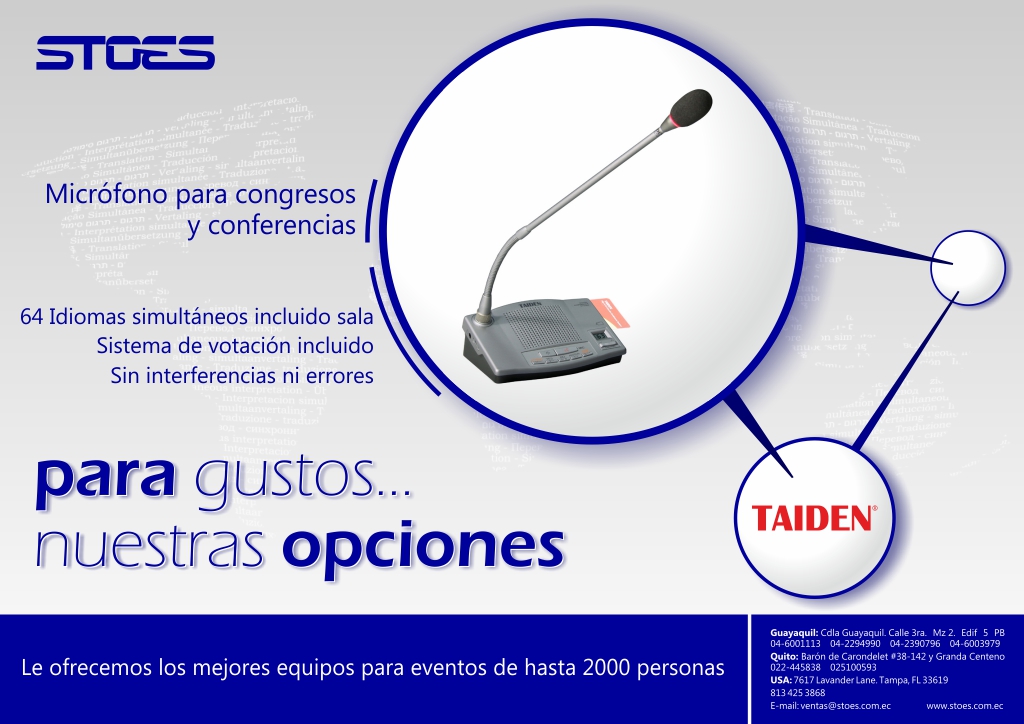 Para gustos… nuestras opciones. Micrófono para congresos y conferencias en septiembre 30, 2013septiembre 30, 2013 Por traductoressimultaneos Usted nos puede escribir a: ventas@stoes.com.ec Visítenos además en: www.stoes.com.ec www.traduccionesecuador.com Share Haz clic para compartir en X (Se abre en una ventana nueva) X Haz clic para compartir en Facebook (Se abre en una ventana nueva) Facebook Haz clic para compartir en LinkedIn (Se abre en una ventana nueva) LinkedIn Haz clic para compartir en WhatsApp (Se abre en una ventana nueva) WhatsApp Me gusta Cargando...