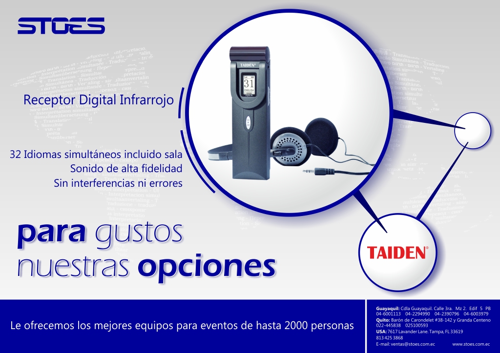 Para gustos nuestras opciones. Receptor digital infrarrojo en septiembre 25, 2013septiembre 25, 2013 Por traductoressimultaneos Usted nos puede escribir a: ventas@stoes.com.ec Visítenos además en: www.stoes.com.ec www.traduccionesecuador.com Share Haz clic para compartir en X (Se abre en una ventana nueva) X Haz clic para compartir en Facebook (Se abre en una ventana nueva) Facebook Haz clic para compartir en LinkedIn (Se abre en una ventana nueva) LinkedIn Haz clic para compartir en WhatsApp (Se abre en una ventana nueva) WhatsApp Me gusta Cargando...