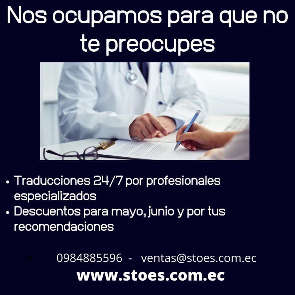 Quédate en casa y no pospongas tus traducciones, comunícate con nosotros y aprovecha nuestras promociones para mayo y junio. Para más información, escriba a ventas@stoes.com.ec.